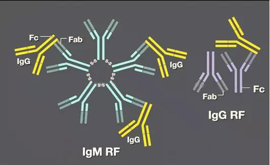 最經(jīng)典的例子是 1940 年代Waaler在某些RA患者血清中發(fā)現(xiàn)類風濕因子 (rheumatoid factors, RF)。在1958年RF血清中呈陽性被美國風濕病學會納入類風濕性關節(jié)炎確診標準里,一起被列入確診標準的還有“晨僵”“關節(jié)活動痛苦或壓痛”“對稱性關節(jié)腫脹”“皮下結(jié)節(jié)”“受累關節(jié)X線片改變”等。但很多沒有 RA 的人也有 RF 陽性。