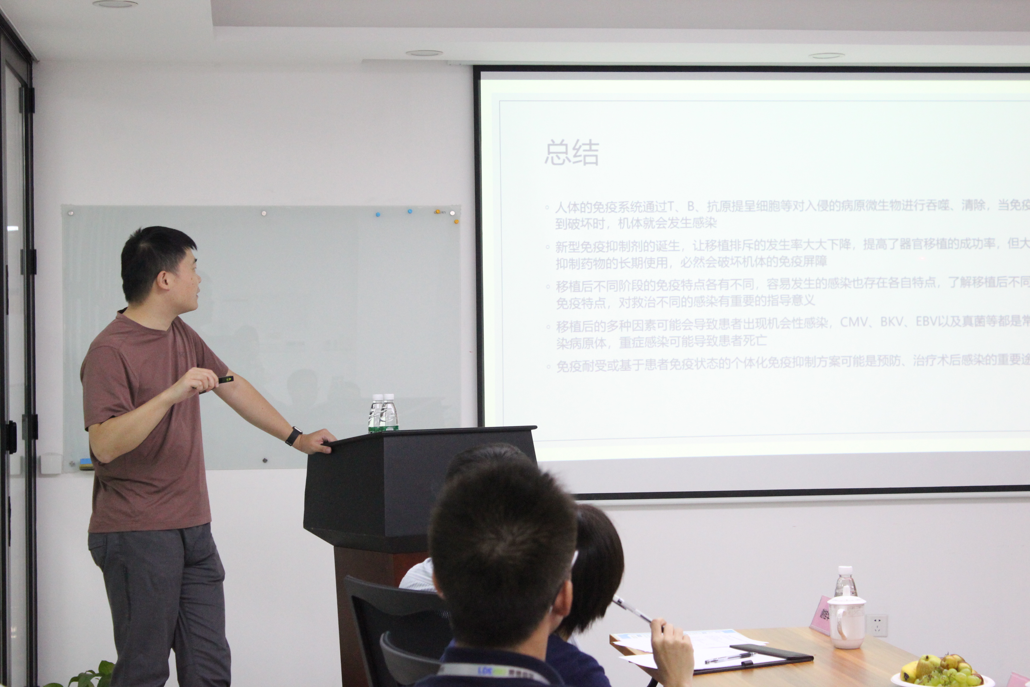 會議繼續(xù)進行,首先由李醫(yī)生介紹移植與感染的臨床現狀,從免疫與感染的關系、移植術后感染的不同病原體類型、及臨床常見的診療方法分別闡述。了解移植后不同階段的免疫特點,對救治不同的感染有重要的指導意義,免疫耐受或基于患者免疫狀態(tài)的個體化免疫抑制方案可能是預防、治療術后感染的重要途徑。