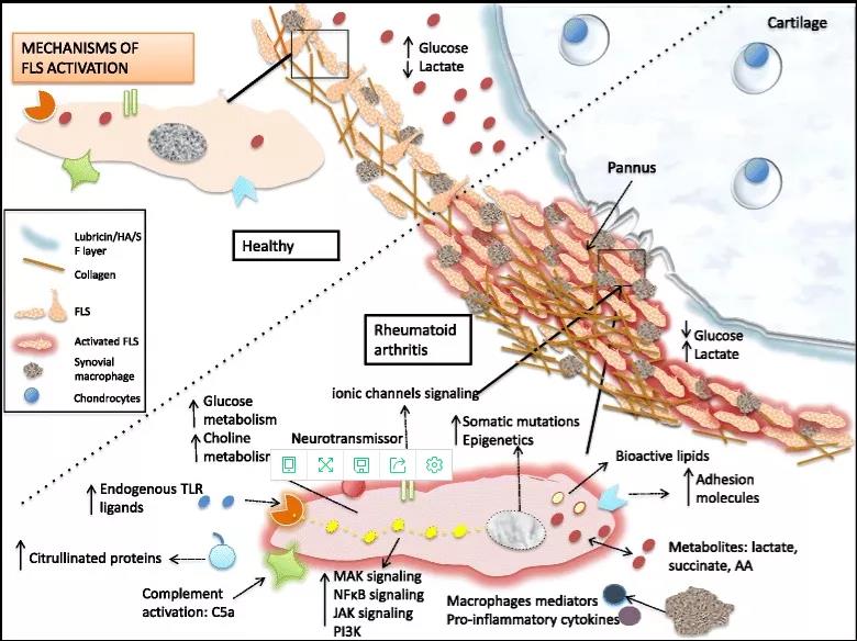 包括兩類(lèi),巨噬細(xì)胞樣滑膜細(xì)胞和成纖維細(xì)胞樣滑膜細(xì)胞(FLS),F(xiàn)LS在RA發(fā)病過(guò)程中扮演了重要的角色,是RA滑膜組織中最常見(jiàn)的細(xì)胞類(lèi)型。RA關(guān)節(jié)中的促炎環(huán)境(包括高水平的細(xì)胞因子、生長(zhǎng)因子及浸潤(rùn)的炎性細(xì)胞)強(qiáng)烈激活FLS,F(xiàn)LS產(chǎn)生炎性因子,促進(jìn)細(xì)胞基質(zhì)降解導(dǎo)致軟骨和骨的持續(xù)性破壞,同時(shí)還刺激滑膜細(xì)胞增殖,遷移并侵蝕破壞關(guān)節(jié)軟骨,導(dǎo)致畸形[6] 。