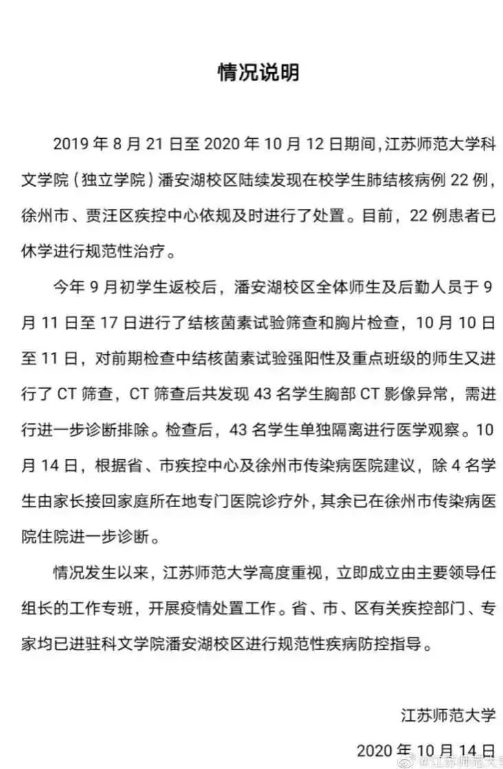 2019年8月21日至2020年10月12日期間,江蘇師大潘安湖校區(qū)陸續(xù)發(fā)現(xiàn)在校學生肺結(jié)核病例22例,患者均已休學并進行持續(xù)至少半年的規(guī)范抗結(jié)核治療。經(jīng)重點篩查,另發(fā)現(xiàn)43名學生胸部CT影像異常,需進一步排查。